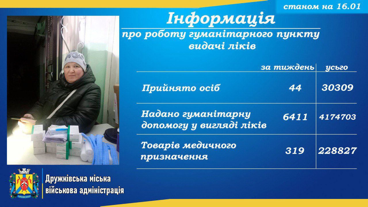 Дружківська міська військова адміністрація повідомляє про роботу гуманітарного пункту видачі ліків.
